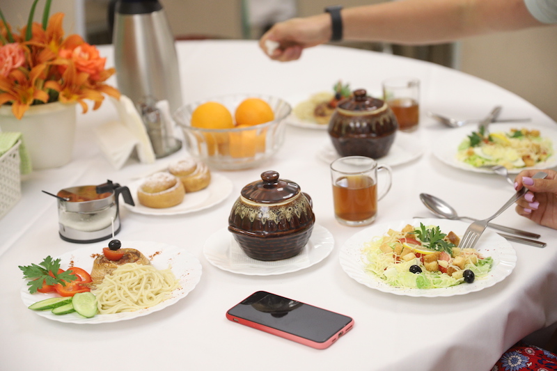 Большой современный зал столовой располагает приятно и комфортно провести время, насладиться здоровой и вкусной кухней. Для тех, кто проживает в номерах люкс, предусмотрен отдельный зал. Также каждый отдыхающий может посетить кафе «Пирс», летнюю площадку или заказать дополнительные блюда в номер.