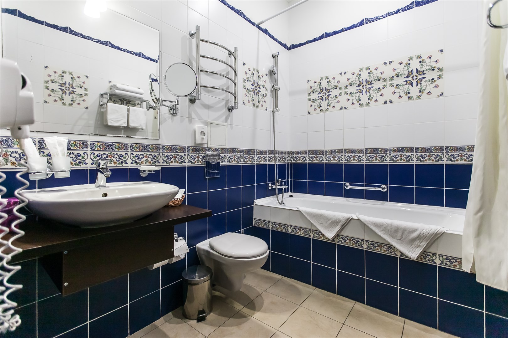 Санузел: угловая ванна, раковина, унитаз, биде, туалетные принадлежности, фен, набор полотенец, тапочки, халат