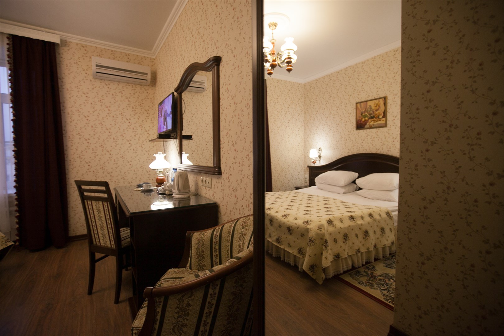 В номере: две односпальные (90*200 см.) кровати – трансформеры, сдвигаются без шва, тв цифровое, телефон, кондиционер, мини-холодильник, письменный стол, стул, зеркало, настольная лампа, бра, туалетный стол, пуф, комод-буфет, диван раскладной, кресло, гардероб с вешалками, вешалка для верхней одежды, багажница, чайник, кофе-машина