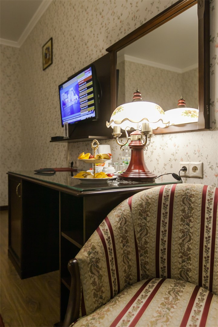 В номере: односпальная кровать (140*200 см.), тв цифровое, телефон, кондиционер, мини-холодильник, письменный стол, стул, зеркало, настольная лампа, бра, гардероб с вешалками, вешалка для верхней одежды, багажница, чайник и чайная пара (блюдце с чашкой)