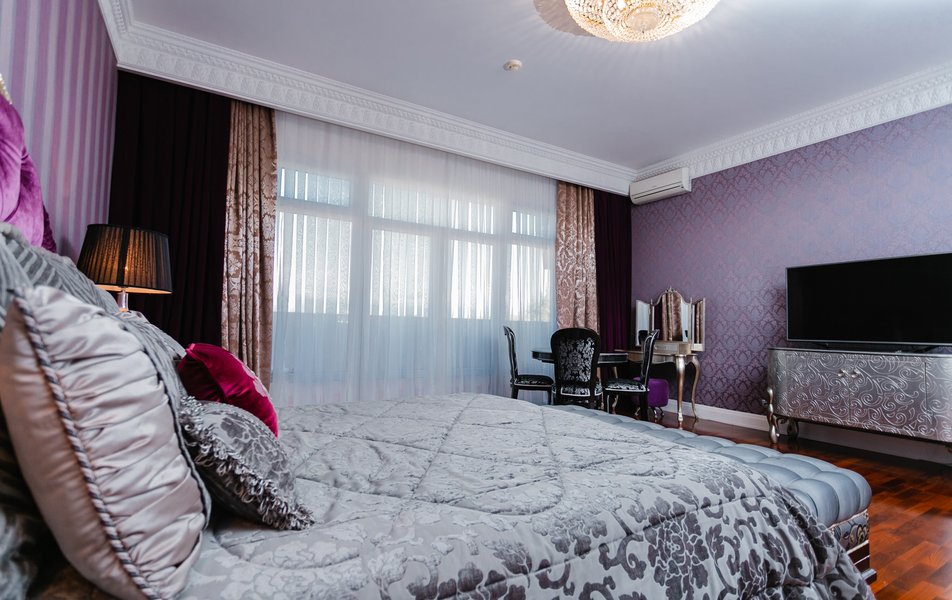 В номере: комод, кровать двуспальная, набор мягкой мебели, прикроватные тумбочки, диван, шкаф для посуды, кондиционер, телевизор, холодильник, электрочайник